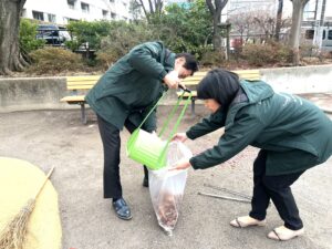 当日は竹ぼうきを使い、園内を隅々まで丁寧に掃き掃除を行い、確認できたゴミはすべて回収いたしました。